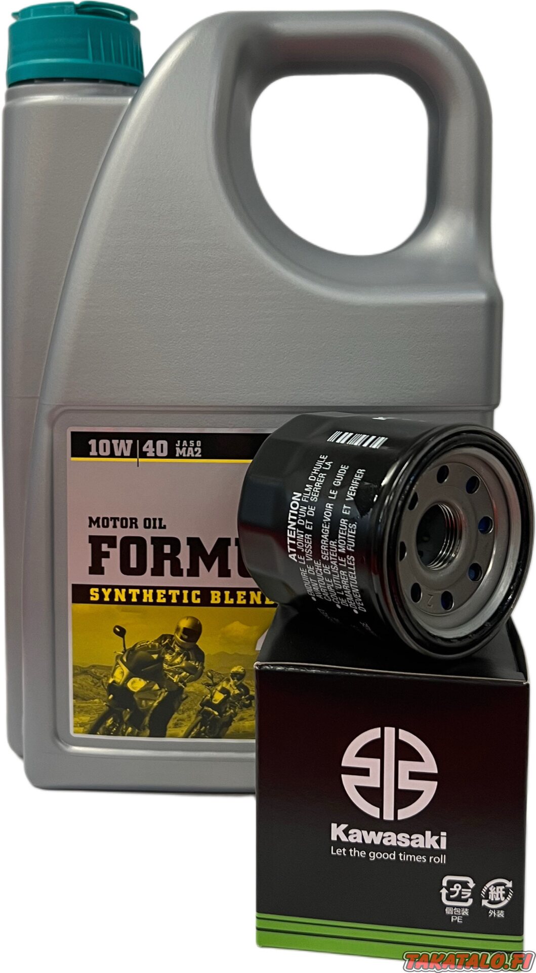 Huoltopaketti on kasattu laadukkaista tarvikkeista ja se sisältää Motorex Formula 10W-40 moottoriöljyä 4 litraa sekä Kawasakin öljynsuodattimen.