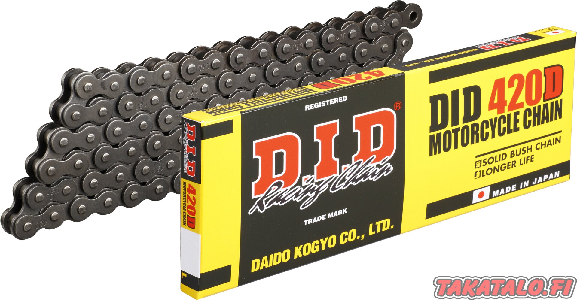 Product description420D on perusketju ilman tiivitsterenkaita. Soveltuu mopojen mopojen tai pikkucrossien ketjuksi. Vetolujuus 1800kg ja paino (100 lenkkiä) 0,7kg ja suositellaan max. 100Cc mottorille. Ketju toimitetaan esivoideltuna ja sisältää pikalukon helppoa asennusta varten. Huomioithan, että ketju saattaa vaatia lyhentämistä sopiakseen täydellisesti pyörääsi ja rataskokoonpanoosi.