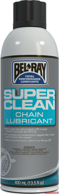 Bel-Ray Super Clean Chain Lube is designed for off-road conditions, meaning it doesn't leave a sticky surface but rather a dirt-repellent one.