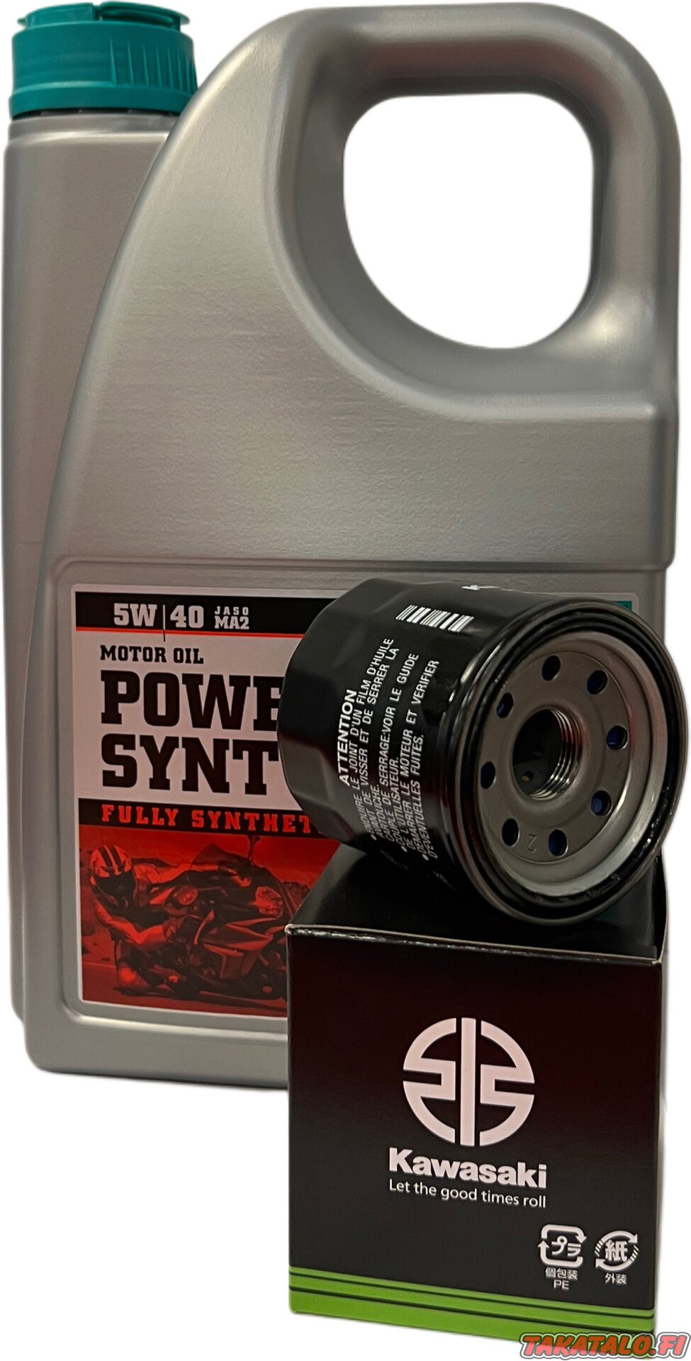 Huoltopaketti on kasattu laadukkaista tarvikkeista ja se sisältää Motorex Power Synt 5W-40 moottoriöljyä 4 litraa sekä Kawasakin öljynsuodattimen.