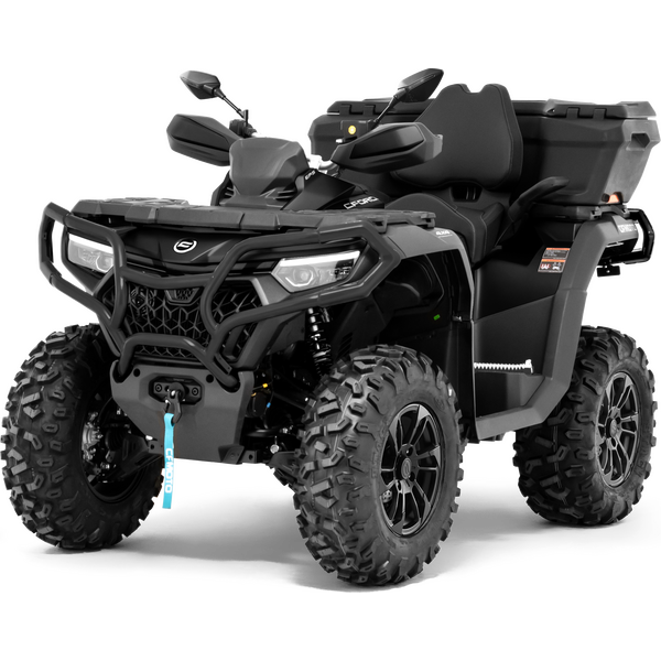 CFORCE 850 Touring Black Edition on nimensä mukaisesti musta väriltään. Siinä on vakiona kattava varustelista: Vinssi, LED-ajovalot, säädettävä ohjaustehostin, 3-ajomoodia, 14" alumiinivanteet 26" maastorenkailla, vetokuula ja valopistoke, iso 7" näyttö bluetooth yhteydellä, käsisuojat, etu- ja takapuskurit sekä lukittava takalaatikko.