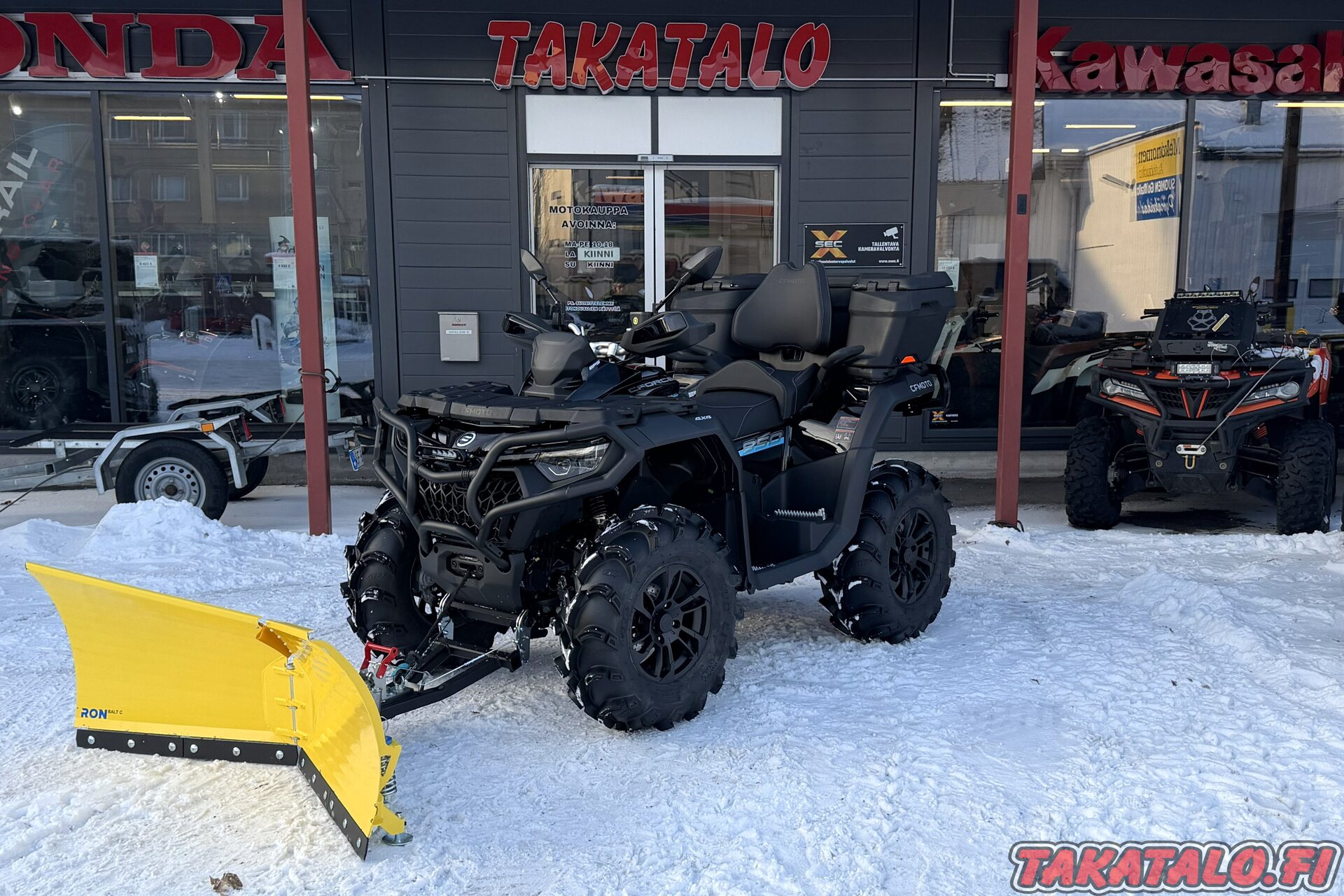 Vakiona löytyy mm. 3500lbs vinssi, etu- ja takapuskuri, iso värinäyttö, 3-ajomoodia, säädettävä ohjaustehostin, sähköisesti kytkettävä neliveto ja etuperän lukko, LED ajovalot ym. ym.
