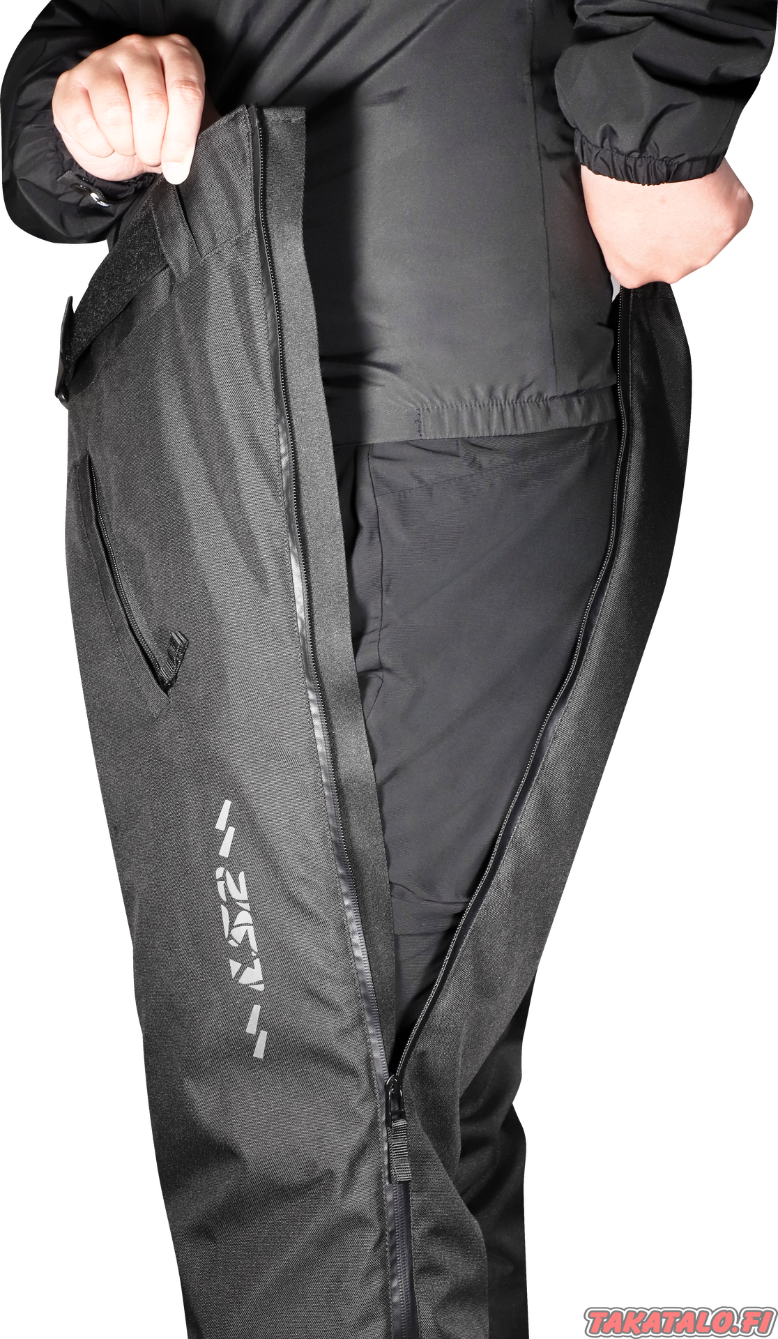 - Helppo pukea ja riisua: Täyspitkät vedenpitävät sivuvetoketjut mahdollistavat housujen pukemisen suoraan omien vaatteiden päälle vaivatta.
