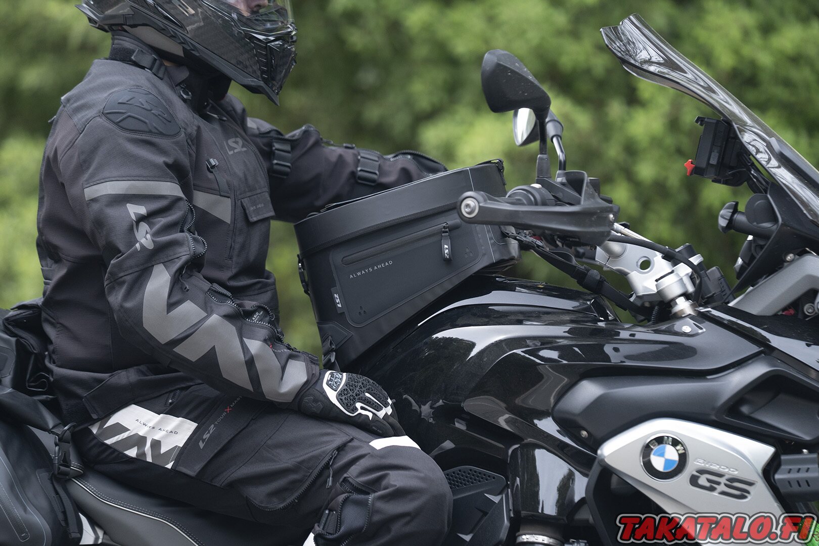 Käytettävyys on huomioitu pienimmissäkin yksityiskohdissa: pikalukitteiset hihnat tekevät tankkaamisesta vaivatonta, ja irrotettava, kosketusherkkä puhelintasku mahdollistaa navigoinnin seuraamisen säältä suojassa.
