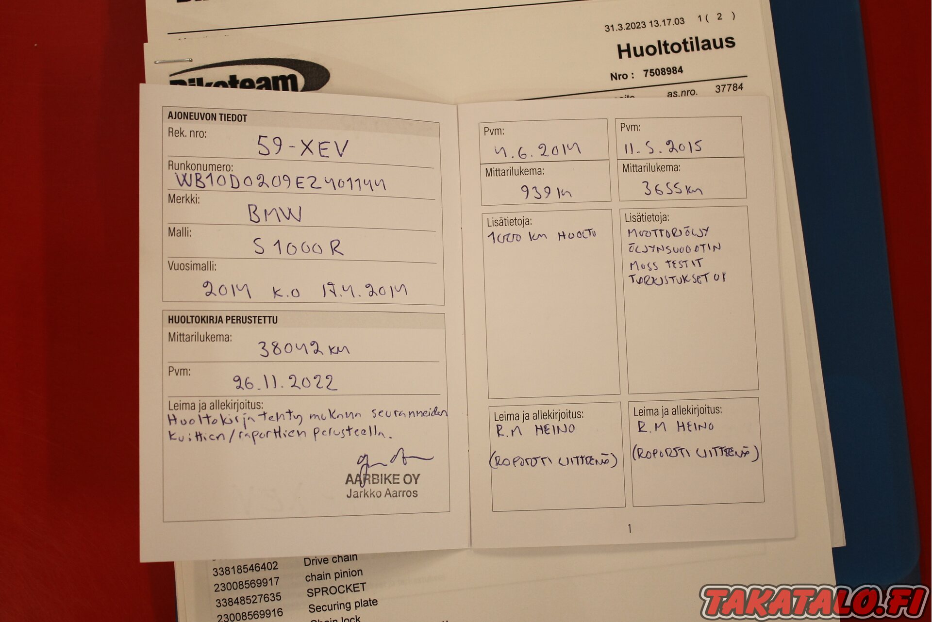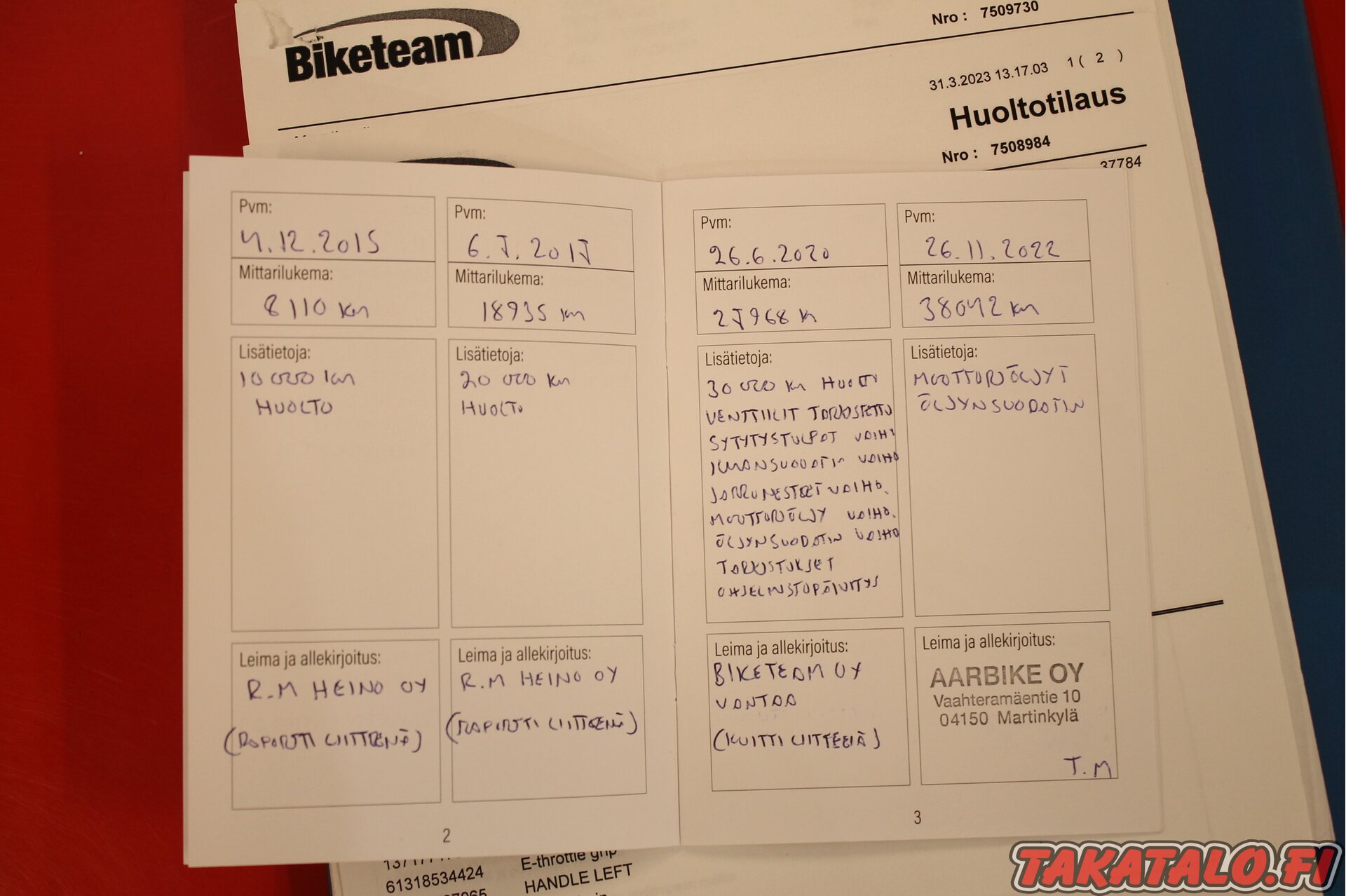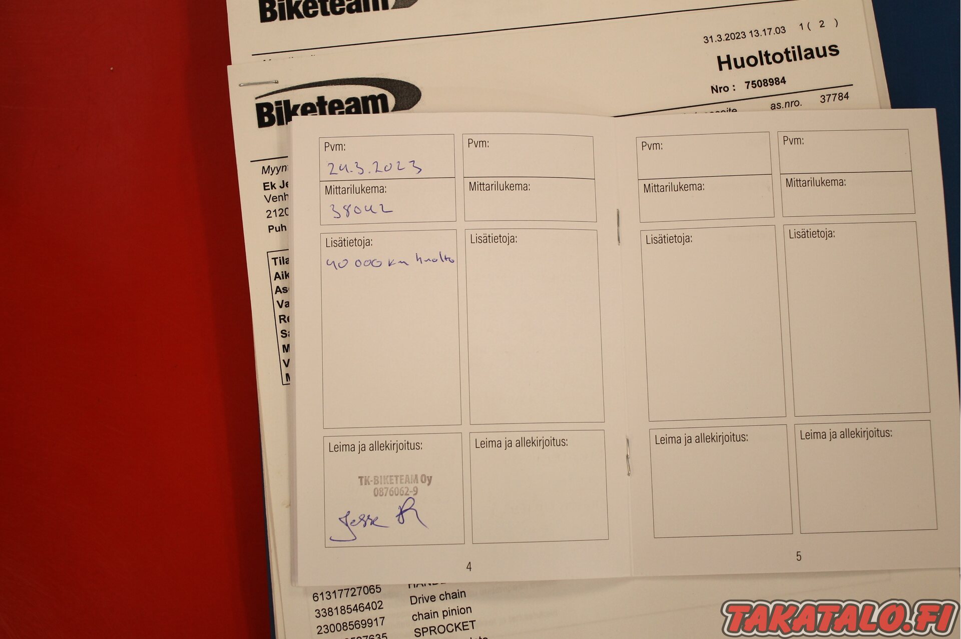 Huoltohistoriaa on mukana tulostettuna, sekä jälikäteen tehty uusi huoltokirja vanhojen dokumenttien pohjalta. Viimeisin huolto on juuri tehty iso 40tkm huolto, jossa myös venttiilien välykset tarkistetaan ja tähän pyörään myös keulahuolto tehty samalla!