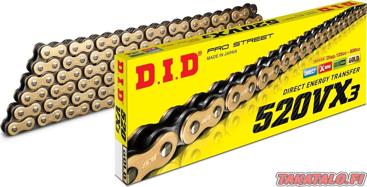 Popis produktuVX-sarjan moottoripyörän ketjut on D.I.D:n myydyimmät ketjut, joita voidaan käyttää sekä katupyörissä, että off-road ajoon suunnitelluissa enduro-, adventure- ja motocrosspyörissä.