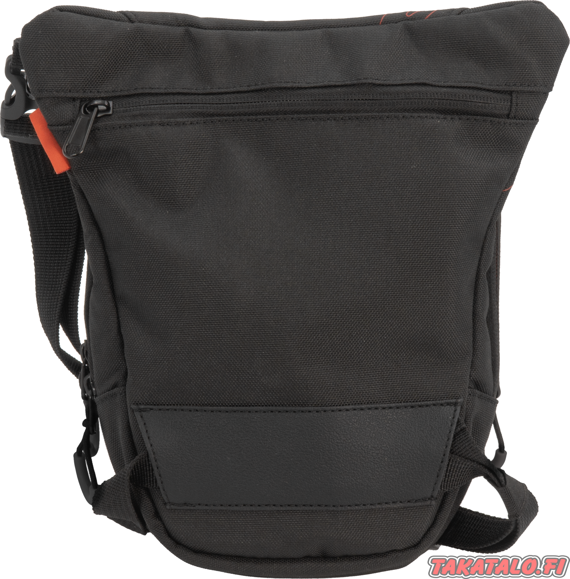 The design focuses on ease of use and organization. Multiple internal compartments, a dedicated smartphone pocket, and large zip pulls allow for effortless handling even while wearing riding gloves. Adjustable waist and leg straps ensure the bag sits securely and discreetly on either leg.