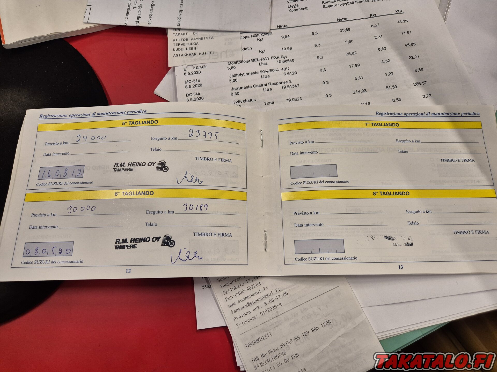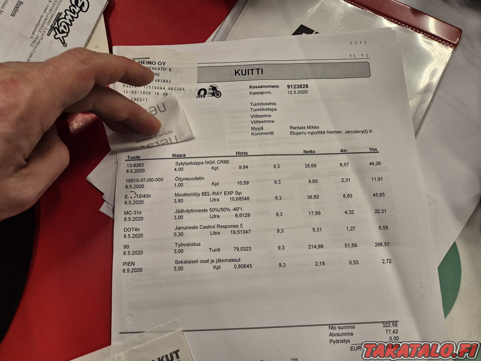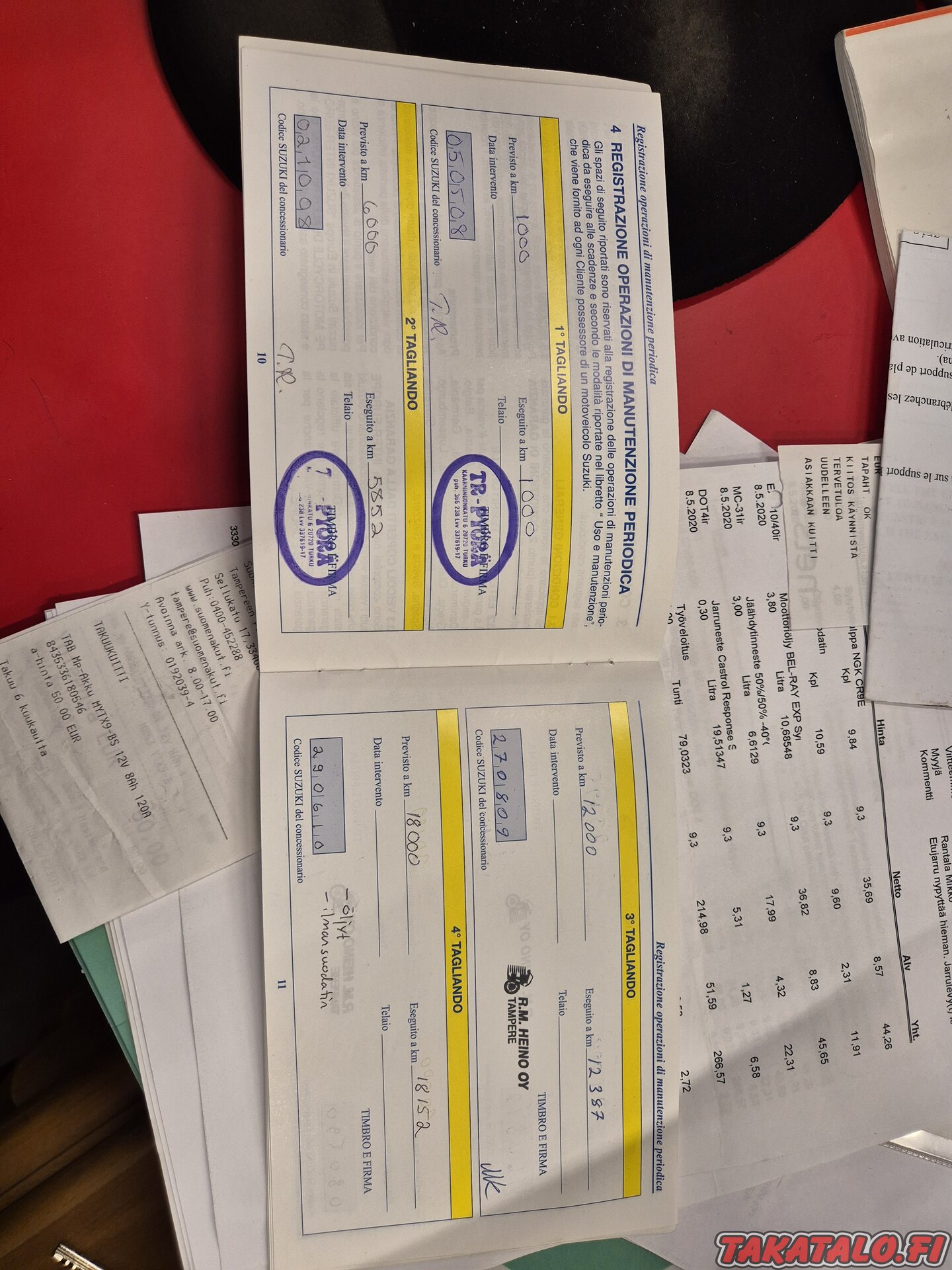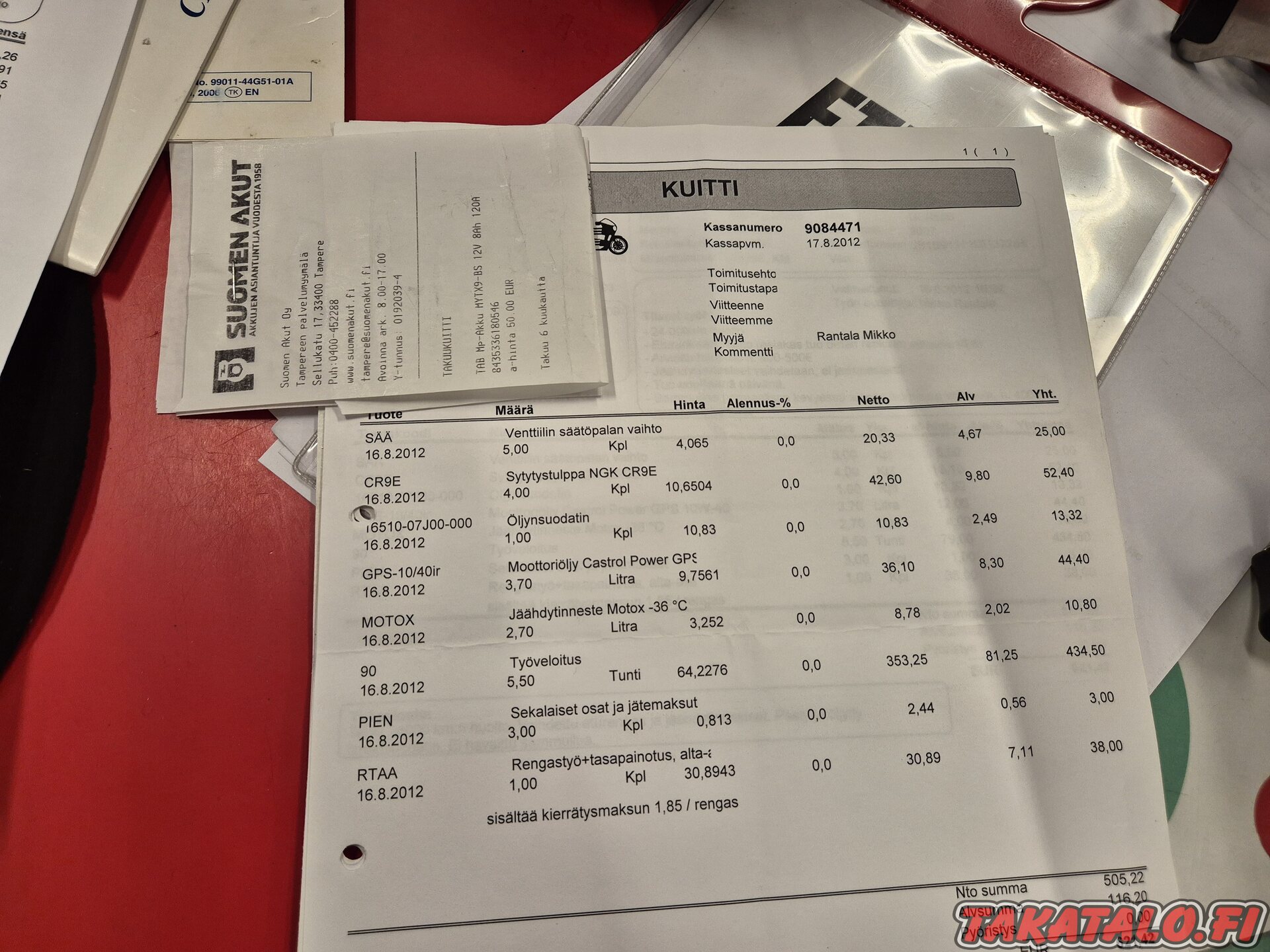 Huoltohistoria on suhteellisen hyvä ja mukaan tulee huoltokirja sekä nippu kuitteja (kuvissa). Viimeisin merkinä löytyy 30tkm. ja edellinen omistaja kertoi, että pyörä olisi keväällä 2025 huollettu. Mutta siitä ei ole muuta kuin miehen sana.
