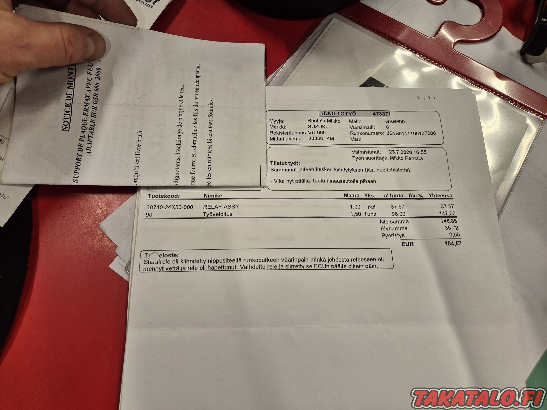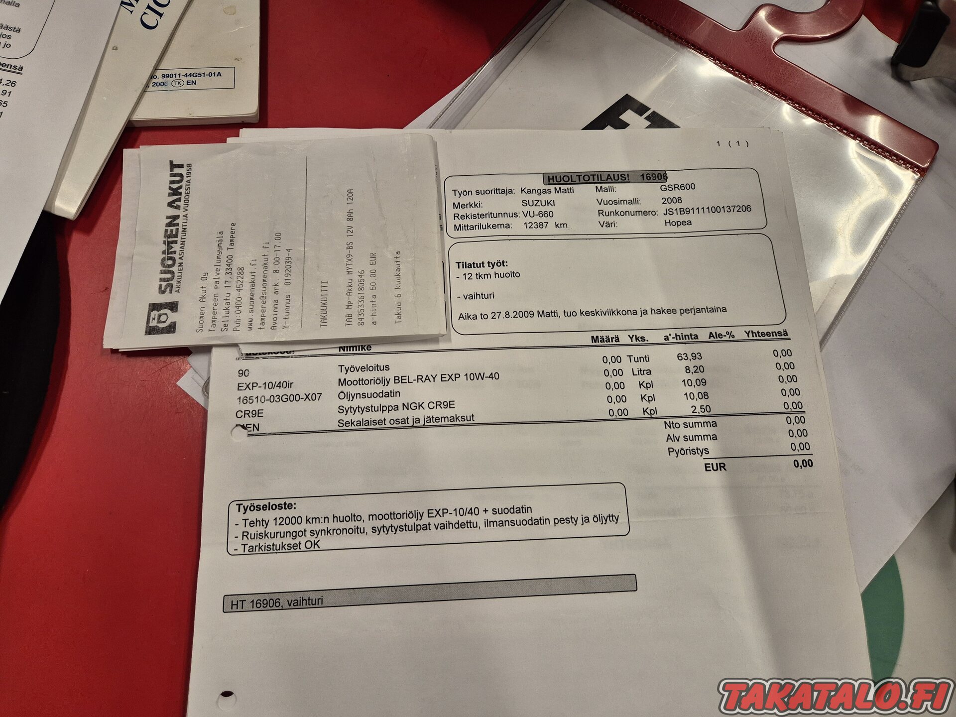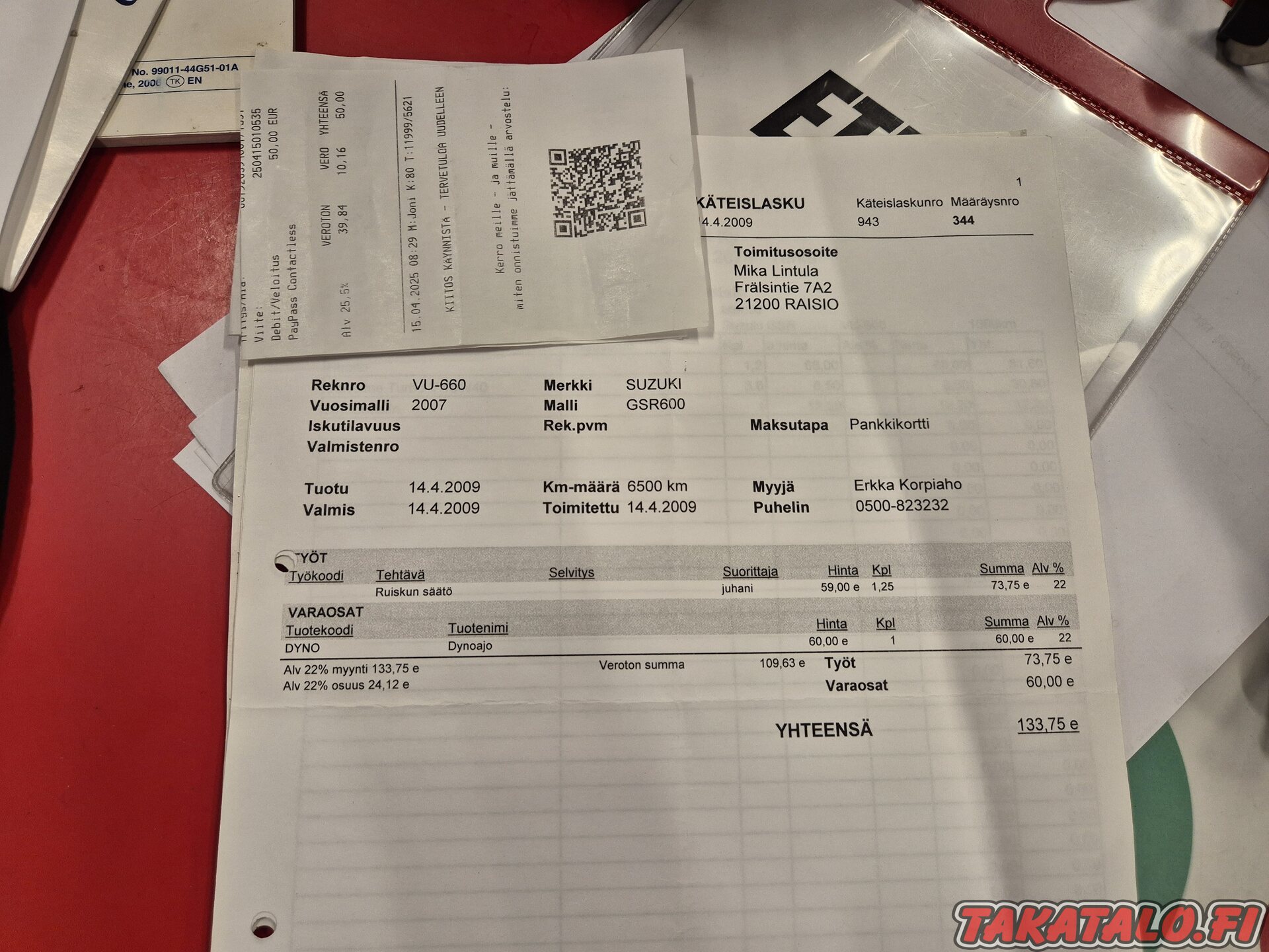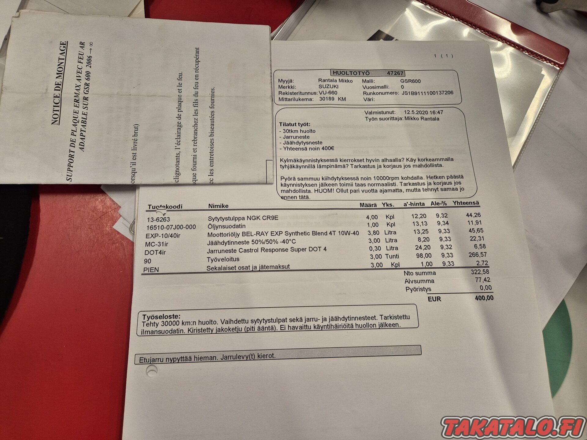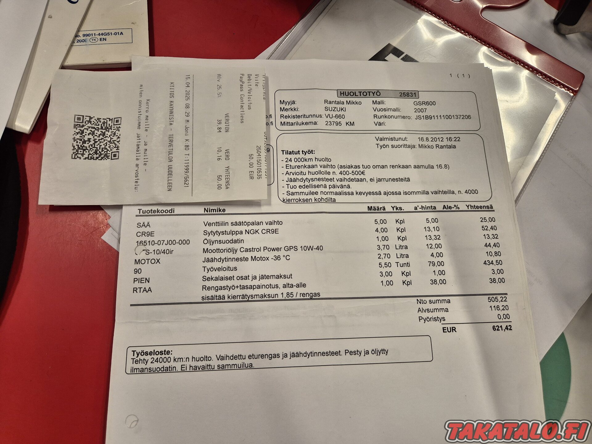 Huoltohistoria on suhteellisen hyvä ja mukaan tulee huoltokirja sekä nippu kuitteja (kuvissa). Viimeisin merkinä löytyy 30tkm. ja edellinen omistaja kertoi, että pyörä olisi keväällä 2025 huollettu. Mutta siitä ei ole muuta kuin miehen sana.