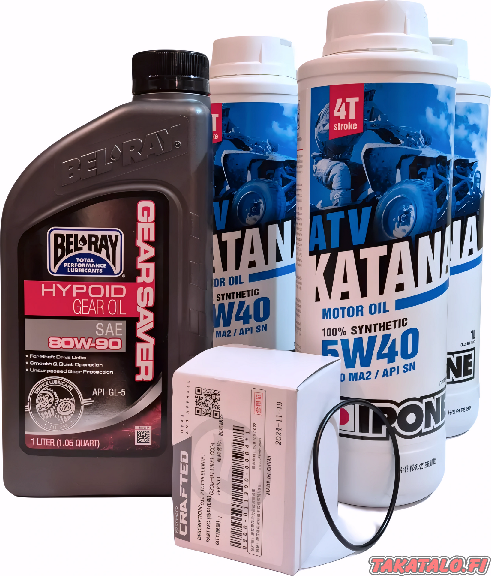 Ready-made package for oil change in single-cylinder CFMOTO and GOES ATVs, including engine oil, gear oil, oil filter, and oil filter cover gasket.