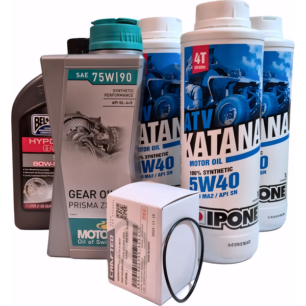Oil change kit for CFMOTO CFORCE, UFORCE, and ZFORCE ATVs equipped with V-Twin two-cylinder engines. Includes engine oils, transmission oil, gear oil, oil filter, and oil filter cover gasket.