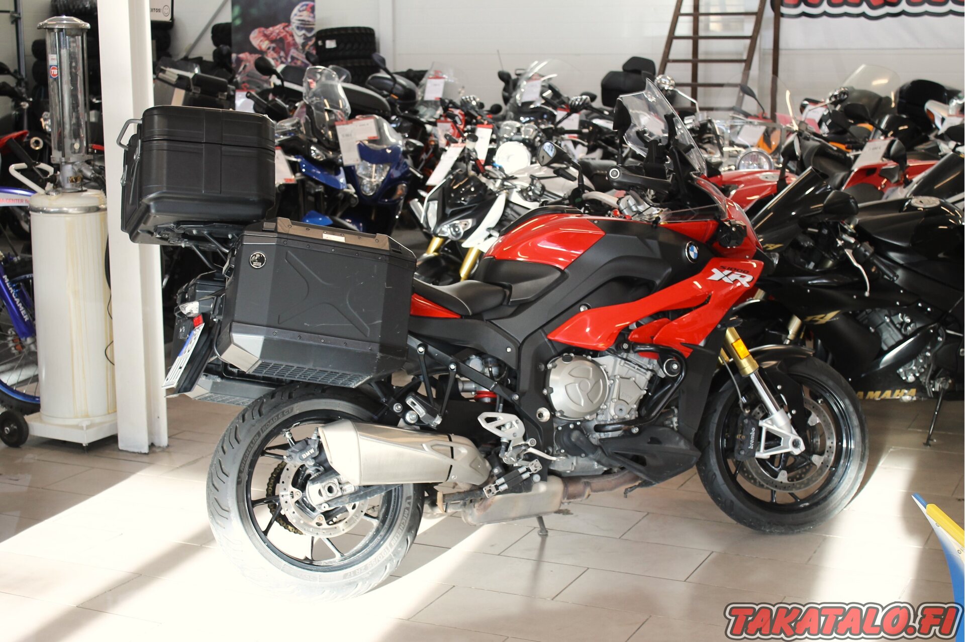 Pirtsakan punainen bemu kolmella laukulla ja hyvillä vakioherkuilla. Pyörässä on uudet renkaat ja aukottomasta huoltokirjasta selviää, että viimeisin huolto on tehty heinäkuussa 69500km kohdalla.