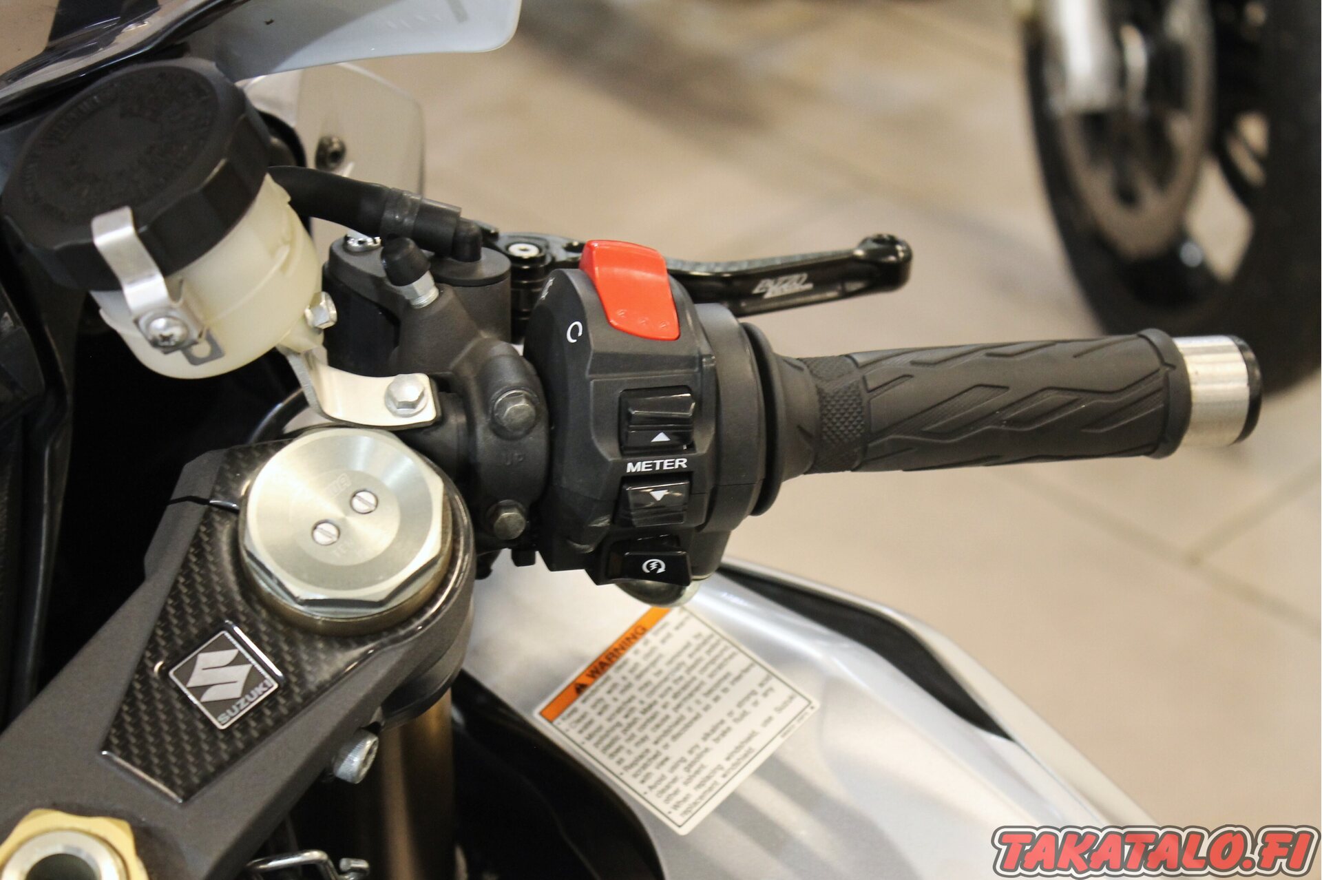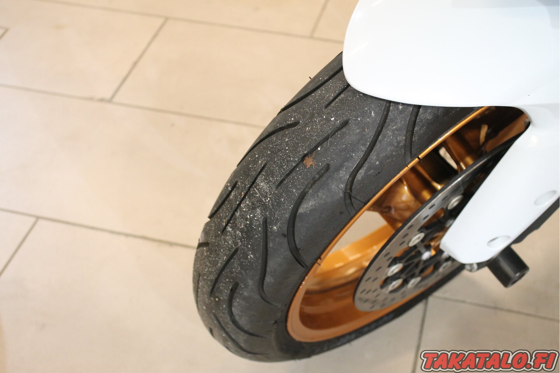 Pientä parantelua on tottakai mökäputki ja säädettävä kahvat, sekä takasatulan tilalle tuleva kate. Matkustajan satula on myös mukaan, kuten myös vakiopeilit jotka nyt on korvattu tollasilla aika nopeilla siivillä missä ei ole vilkkujakaan. Muutama hiilarijäljitelmä katekin on isketty kokonaisuuteen. Hieno pyörä!