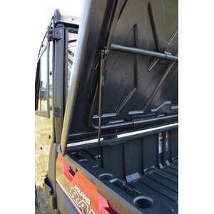 Lukittava lavakate muuttaa Polaris Ranger XP 1000 lavan peräkontiksi. Avaamista auttaa kaasujouset, jotka pitävät katteen auki.