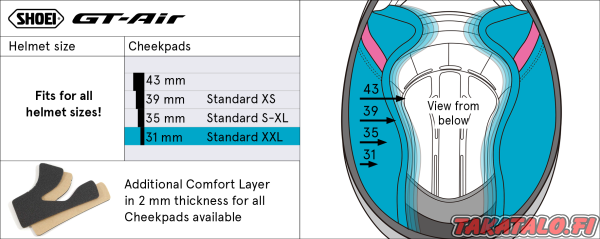 Shoei alkuperäiset poskipalat GT-Air kypärään. Kaikki koot sopivat eri kypärän kokoihin, joten voit optimoida täydellisen istuvuuden eri kokoisilla pehmusteilla.