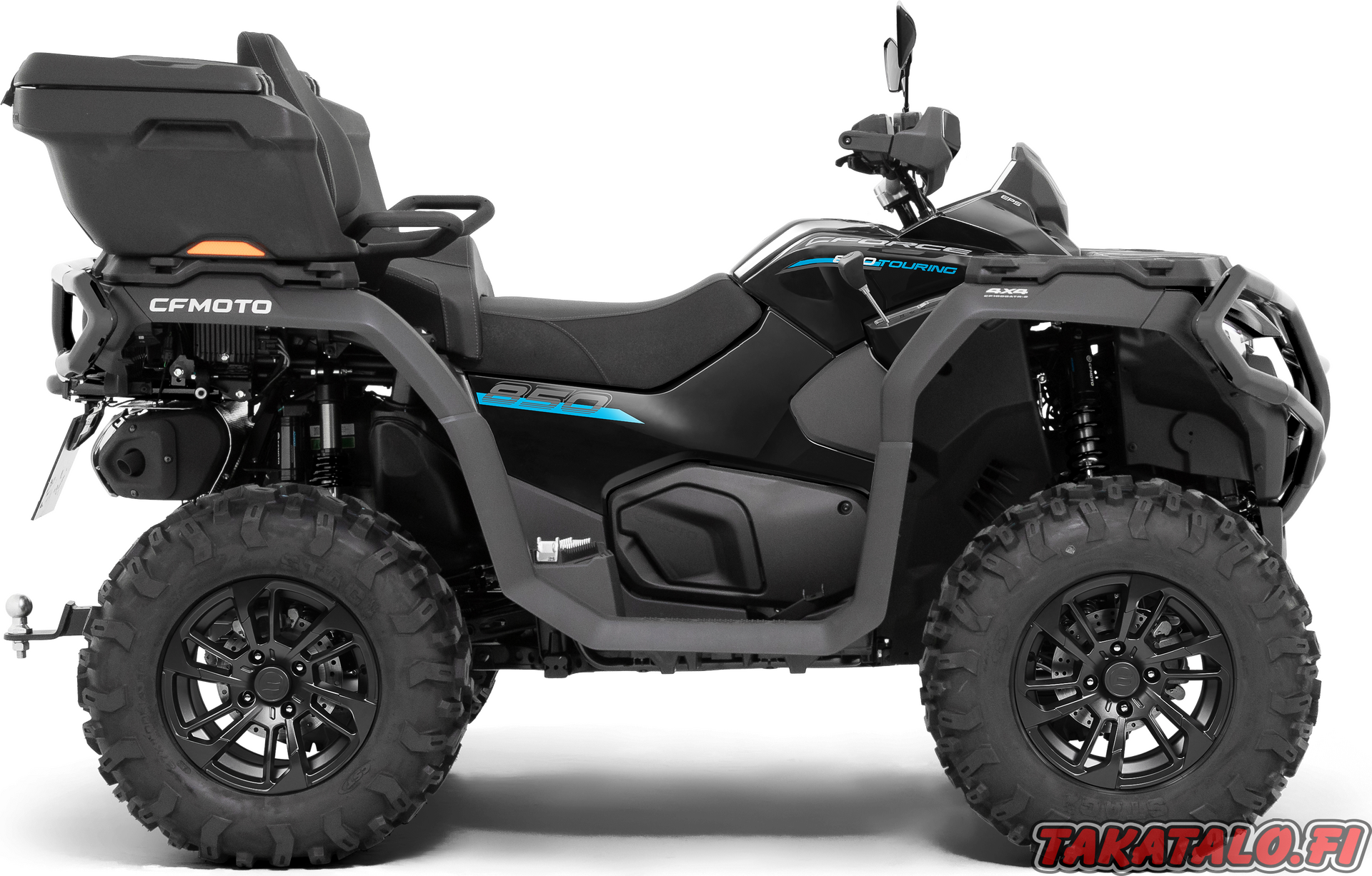 CFORCE 850 Touring Black Edition on nimensä mukaisesti musta väriltään. Siinä on vakiona kattava varustelista: Vinssi, LED-ajovalot, säädettävä ohjaustehostin, 3-ajomoodia, 14" alumiinivanteet 26" maastorenkailla, vetokuula ja valopistoke, iso 7" näyttö bluetooth yhteydellä, käsisuojat, etu- ja takapuskurit sekä lukittava takalaatikko.