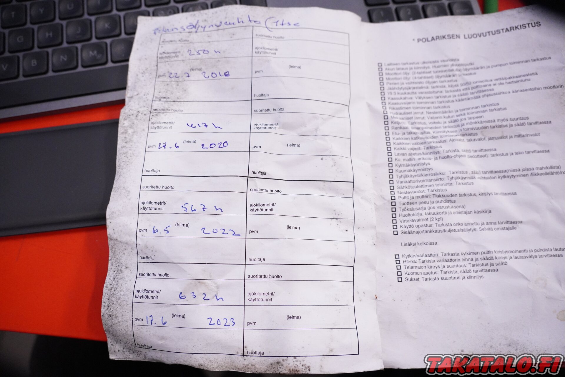 Huoltokirja tuli mukaan ja sieltä löytyy liikkeen leimoja sekä omien öljynvaihtojen merkinnät.