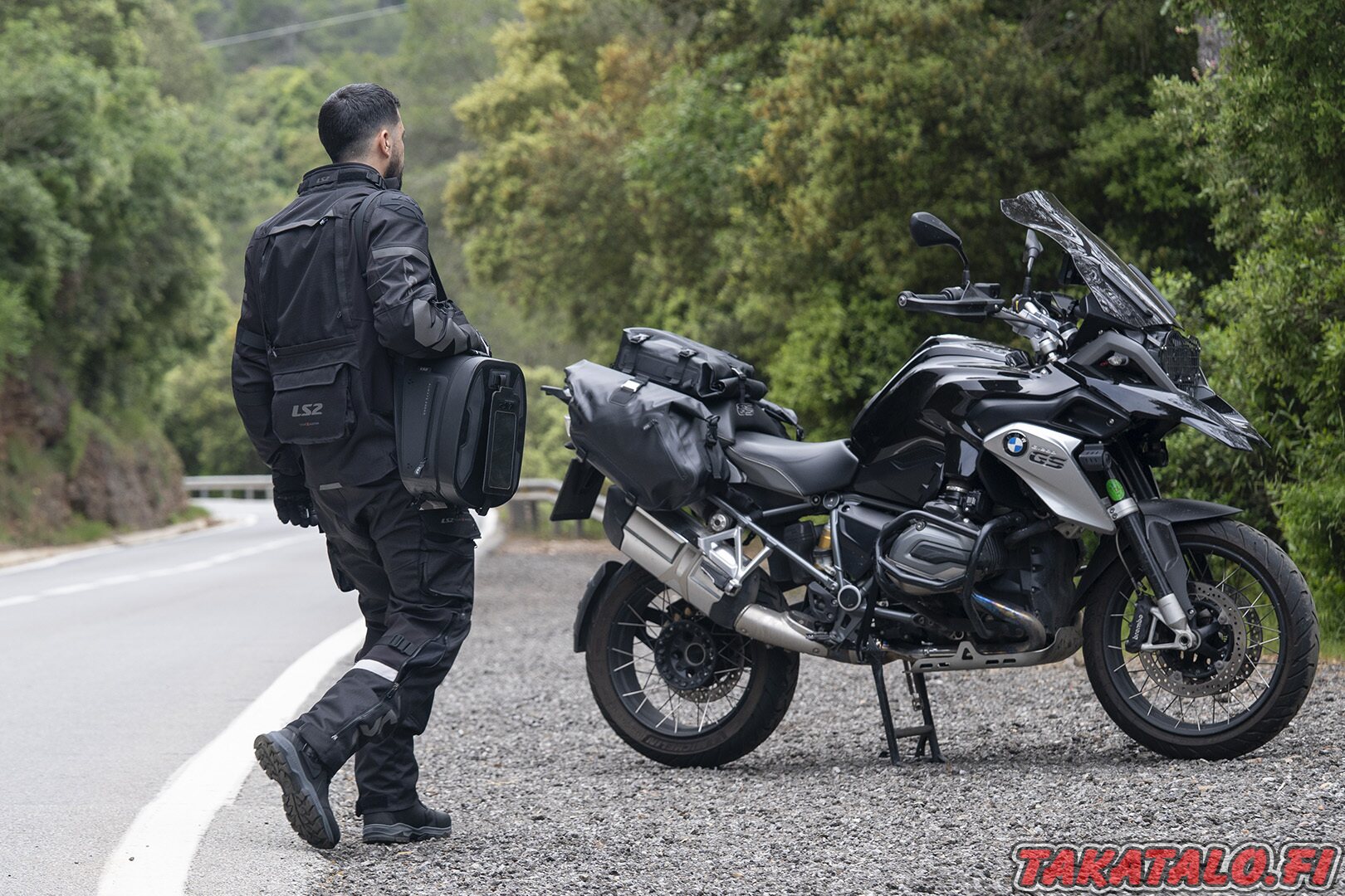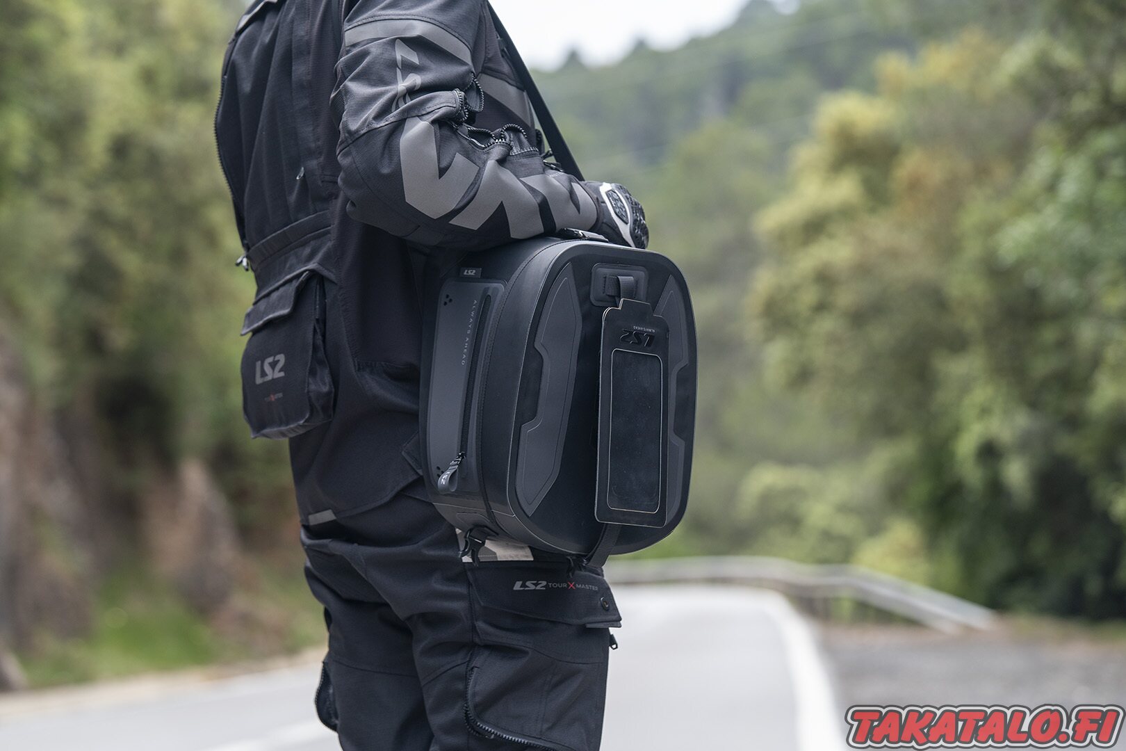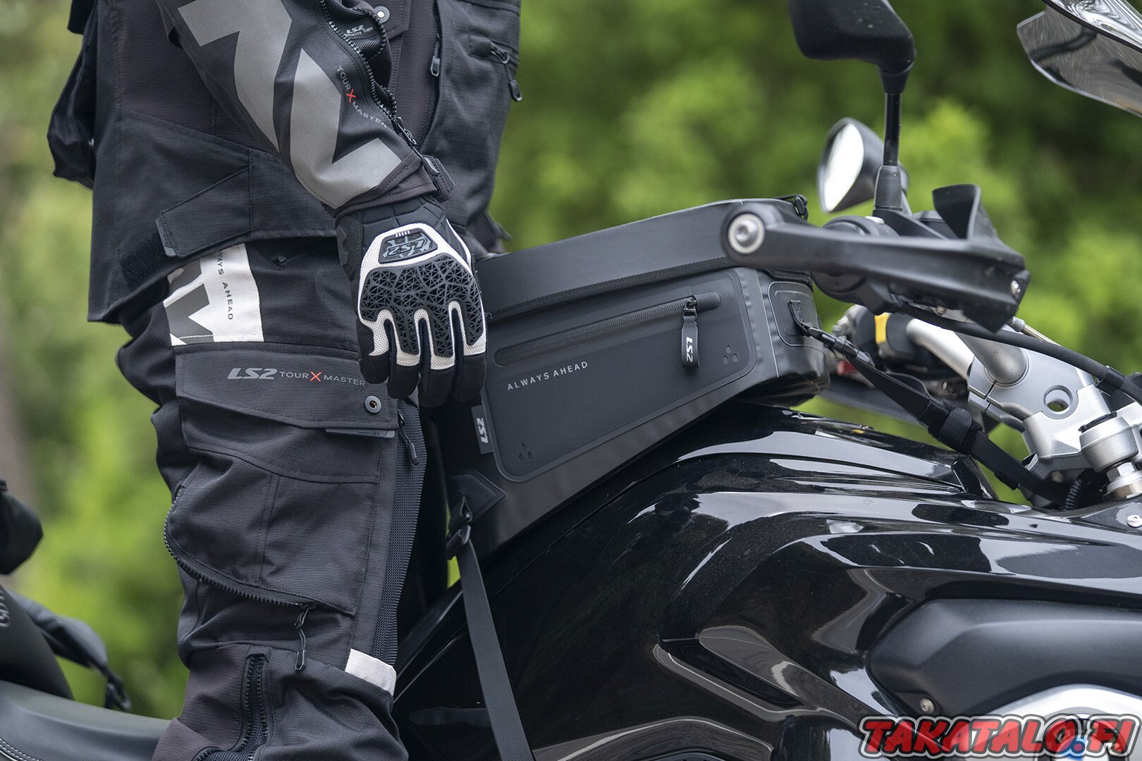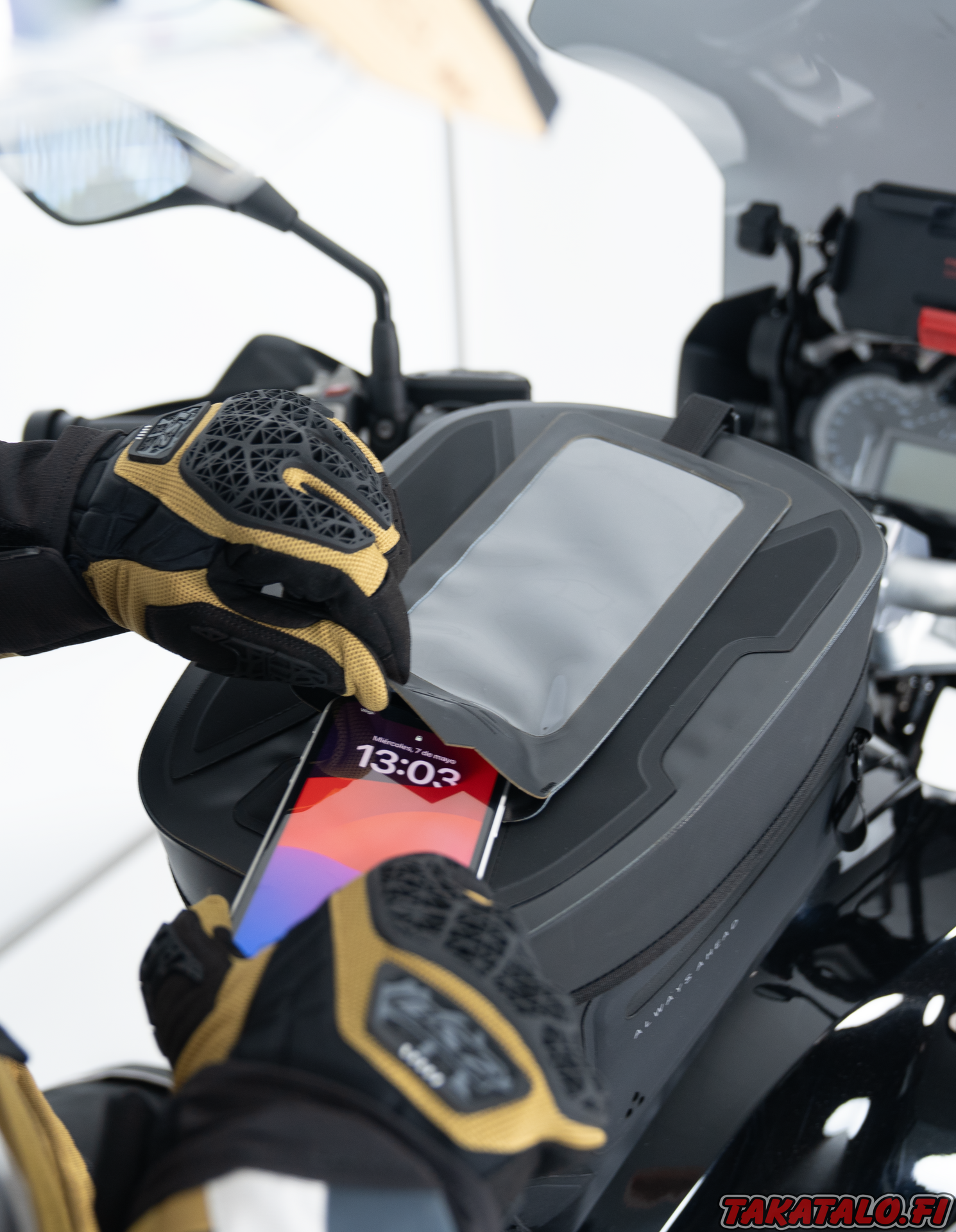 Käytettävyys on huomioitu pienimmissäkin yksityiskohdissa: pikalukitteiset hihnat tekevät tankkaamisesta vaivatonta, ja irrotettava, kosketusherkkä puhelintasku mahdollistaa navigoinnin seuraamisen säältä suojassa.