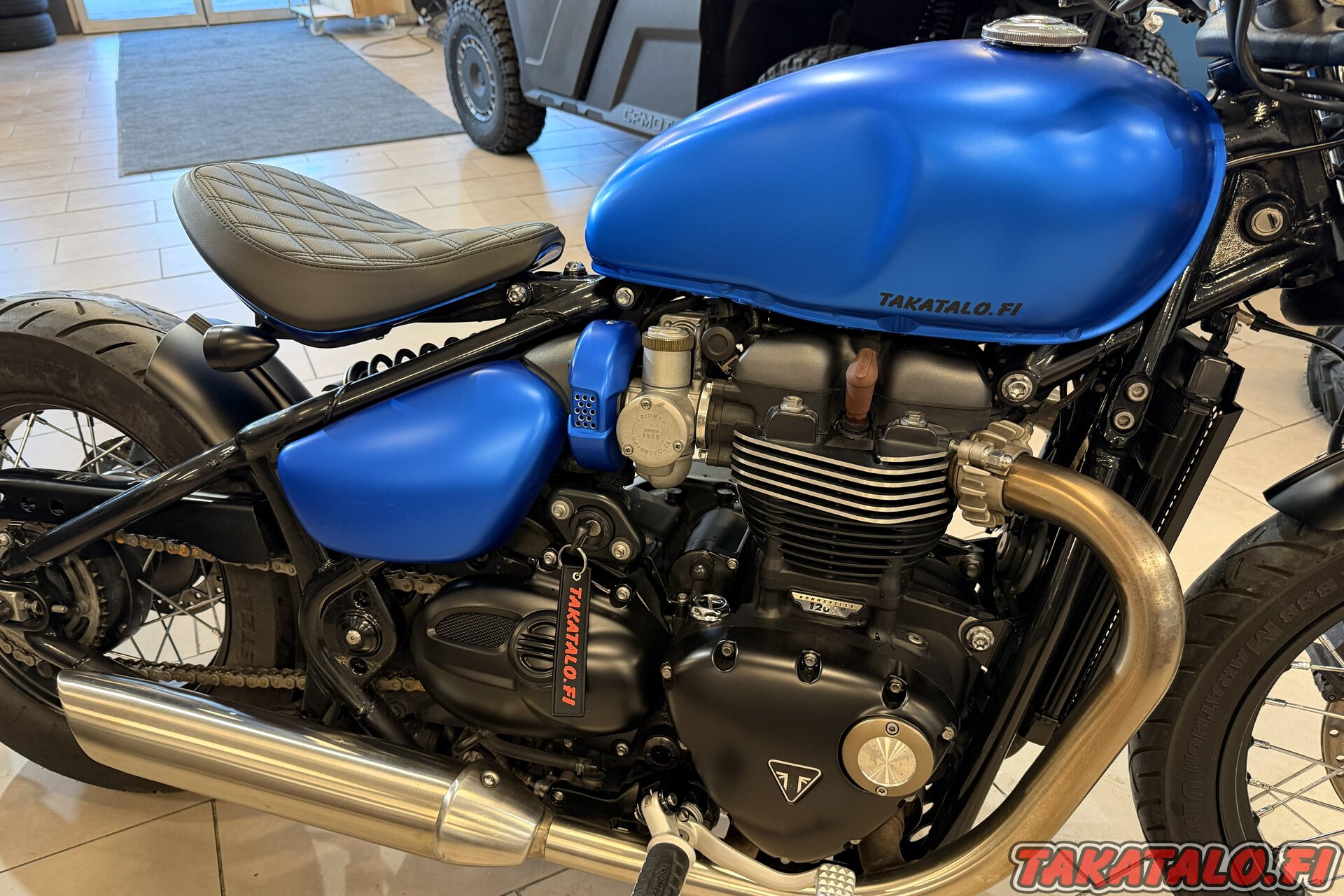 Pyörään on kietaistu tyylikäs sininen teippaus. Väri tekee pyörästä uniikin ja kerää katseita. Tosin teippauksessa voisi olla hieman parantamisen varaa ja fiksailtavaa. Tankin alareunasta teippi on hieman kupruillut. Muuten mintti peli!