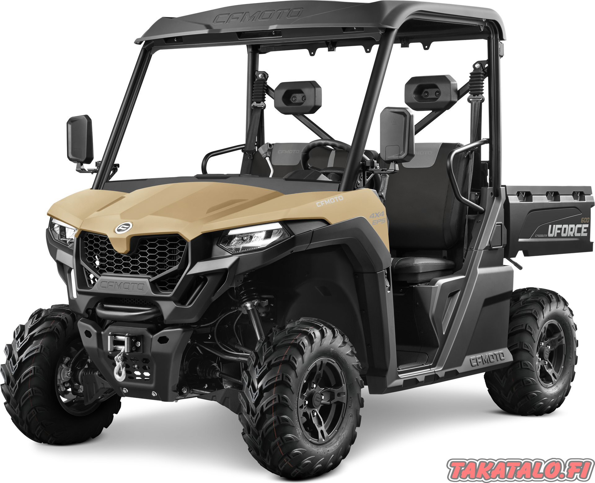 Vakiona UFORCE 600 mönkijässä on mm. ohjaustehostin, kippaava lava, vinssi, vetokuula + peräkärryn pistoke, ohjaamon katto, 25" maastorenkaat ja LED ajovalot.